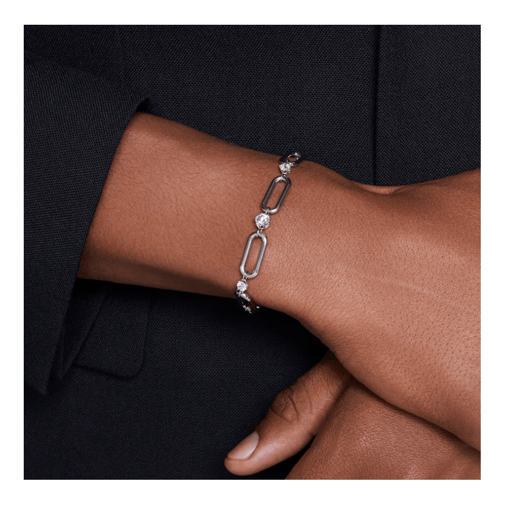 • This White-tone plated bracelet is luxuriously engineered to emphasize the star-filled styling of the Constella family. Fastened with a lobster closure, the stunning piece features an industrial-inspired chain, with round prong-set Swarovski Zirconia placed between the central links. Wear it to give your everyday look a dazzling metallic edge.