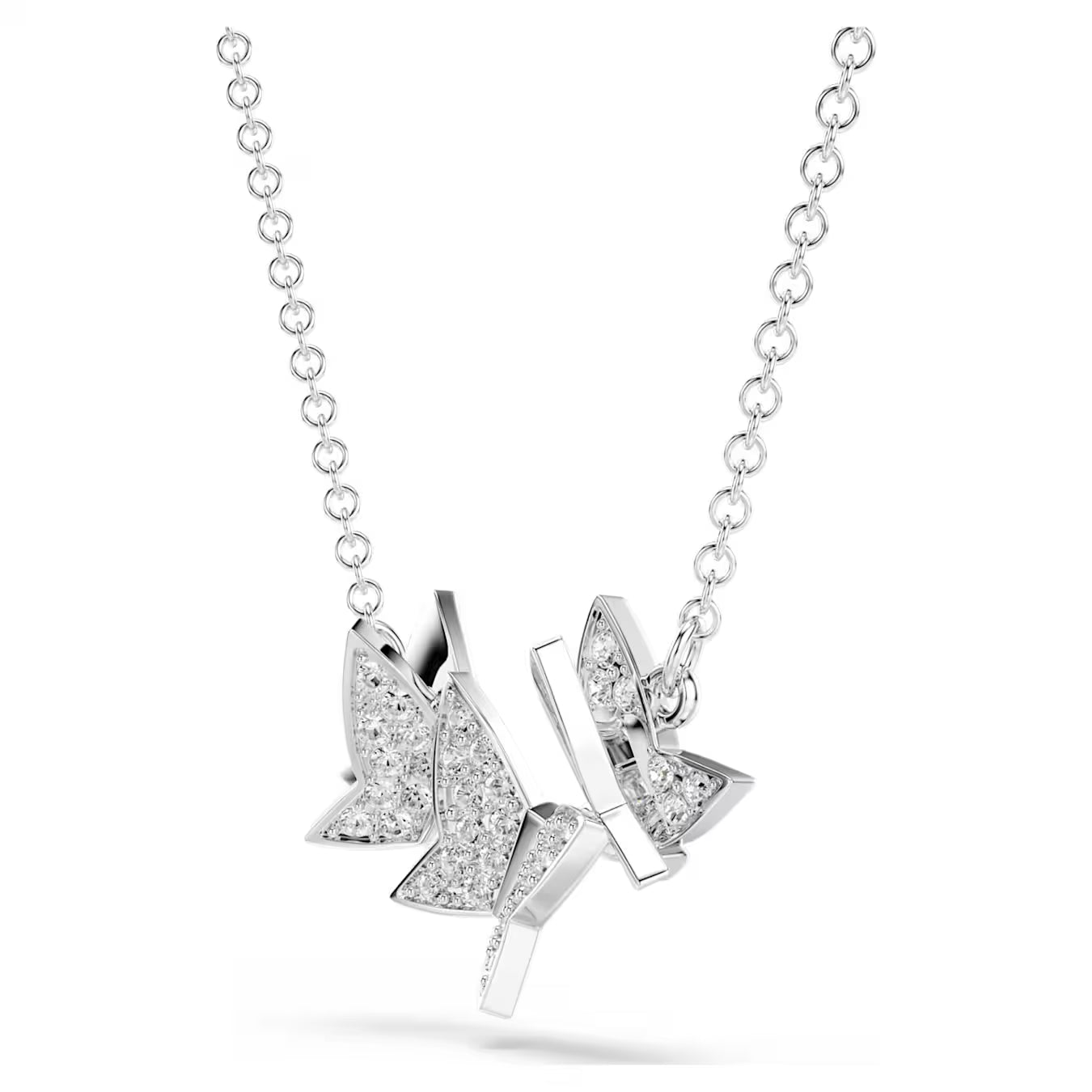 • An elegant choice for everyday, this delicate necklace will become a new wardrobe staple. It features shimmering pavé butterfly motifs suspended from a sleek rhodium plated chain. The perfect partner to white T-shirts, cashmere jumpers, denim, or eveningwear – essentially, anything goes.